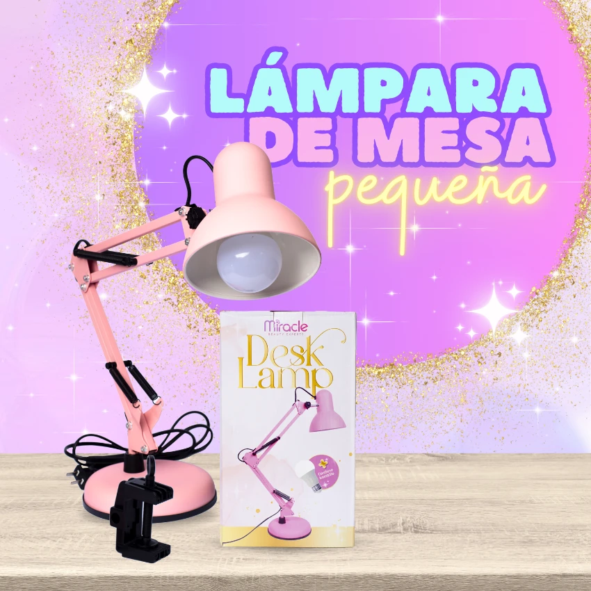 Lámpara de escritorio articulada Miracle en acabado rosa. Su diseño funcional cuenta con brazo flexible y base de abrazadera tipo C para una fijación segura que optimiza el espacio en la mesa de trabajo. Proporciona iluminación focalizada ideal para manicura y tareas de precisión.