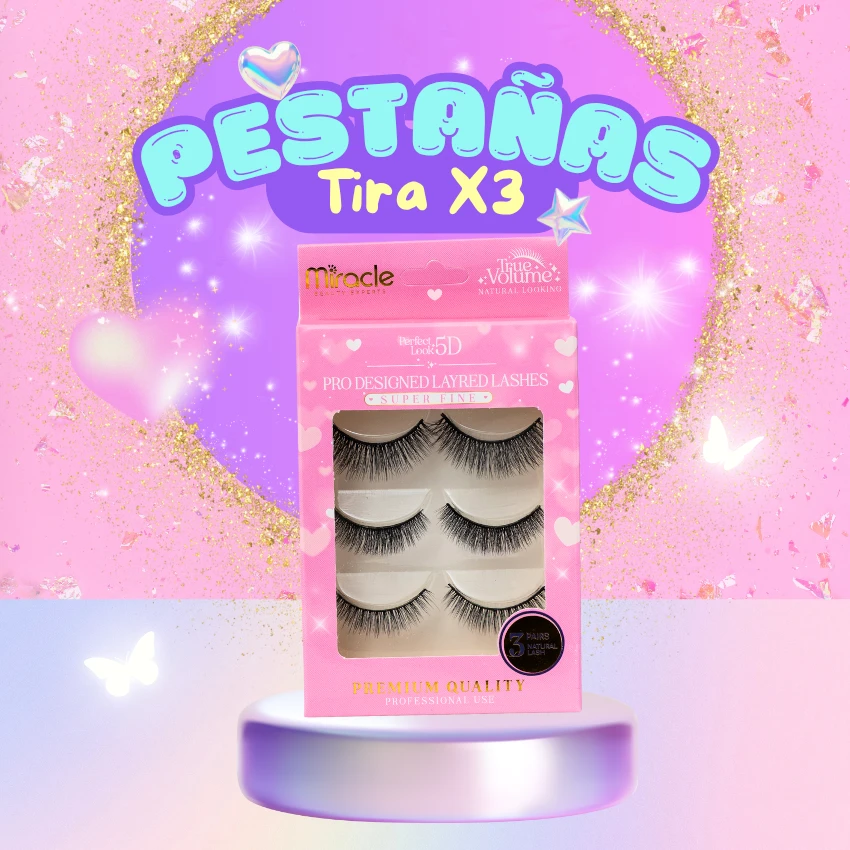 Set de 3 pares de pestañas postizas Miracle con tecnología 5D. Diseño multicapa de fibras súper finas que ofrece volumen y definición con apariencia natural. Tira ligera y flexible para máximo confort. Calidad premium ‘Perfect Look’, ideal para acabados profesionales de maquillaje.